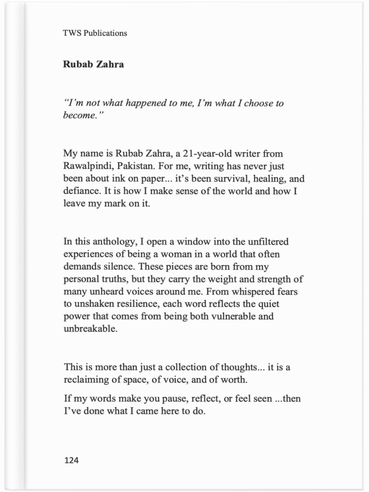 My name is Rubab Zahra, a 21-year-old writer from Rawalpindi, Pakistan. For me, writing has never just been about ink on paper... it’s been survival, healing, and defiance. It is how I make sense of the world and how I leave my mark on it.